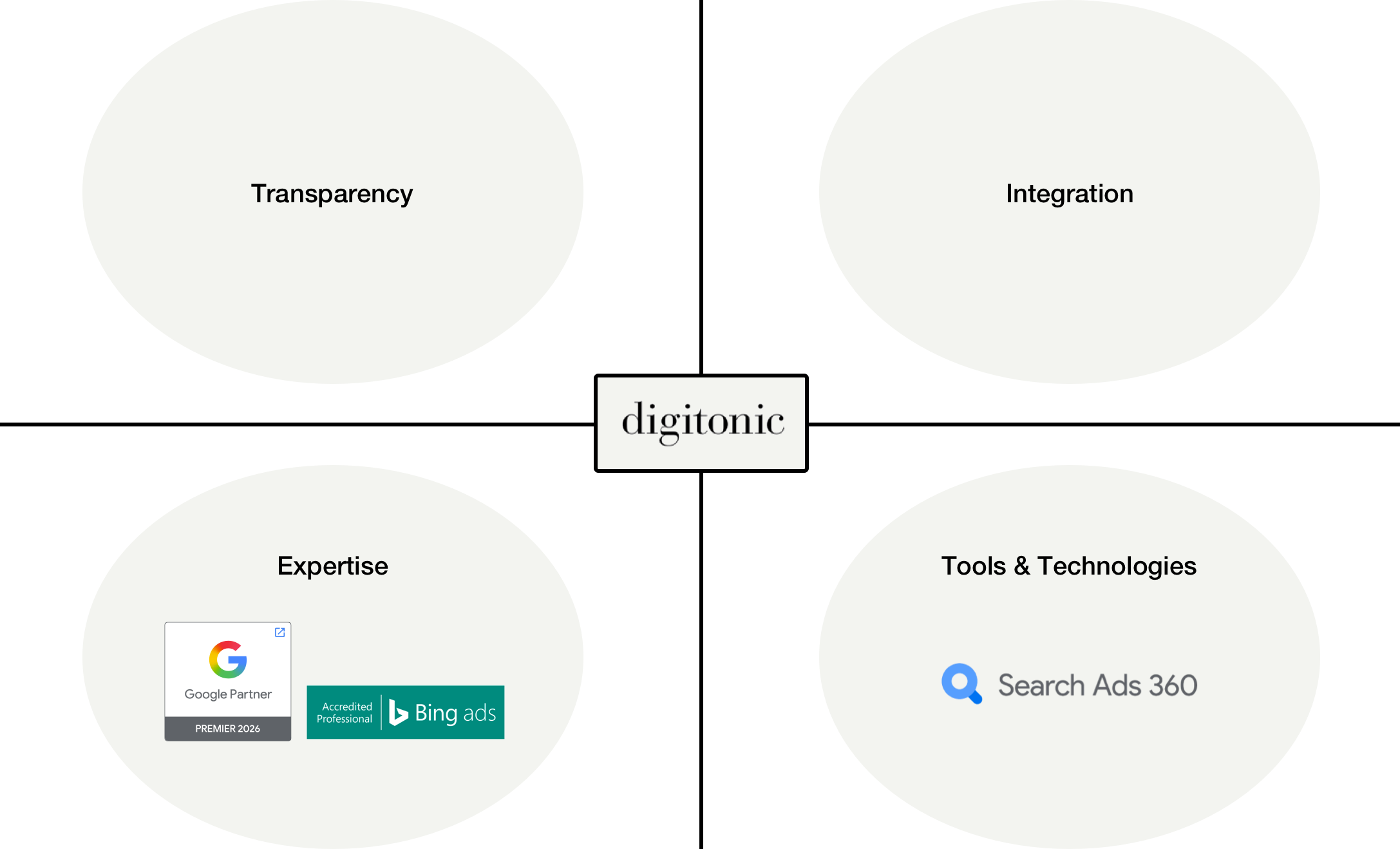 Le SEA est piloté chez digitonic avec une transparence totale, depuis le compte du client. Nous mettons également l’accent sur le tracking des activités search et à l’intégration / déduplication de leur performance dans le dispositif media global.