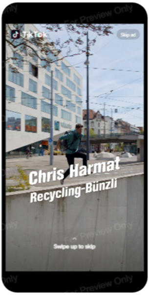 Le réseau social TikTok, à travers sa plateforme publicitaire, propose différents formats d’annonces qui peuvent être réservés en exclusivité et le format publicitaire appelé TopView en fait partie. Mais comment ça marche, le TopView ? Si vous réservez ce format pour votre publicité, cette dernière apparaîtra durant vingt-quatre heures en exclusivité en haut de la page d’accueil des utilisateurs (dans la section « For You ») lorsqu’ils ouvriront l'application TikTok. Le TopView permet donc d’atteindre un maximum d’utilisateurs TikTok au cours d’une même journée. Uniquement en Suisse, on estime à environ 1,6 million le nombre d’impressions pouvant être générées sur le marché. Et les utilisateurs TikTok sont plutôt réceptifs à ce format publicitaire. Selon une étude, environ 76% d’entre eux affirment que les publicités TopView attirent leur attention. Ils sont également 34% à déclarer avoir déjà interagi avec ce type de publicité, soit le taux d’interaction le plus élevé parmi tous les formats publicitaires proposés par TikTok. Ce format exclusif se démarque également en termes de souvenir publicitaire, avec des internautes qui, en moyenne, ont 1,5 fois plus de chances de se rappeler une marque après avoir été exposés à une publicité TopView. Dans le cadre de la nouvelle campagne de notoriété lancée en août dernier pour notre client SwissRecycling, il nous était donc apparu pertinent de proposer ce dispositif publicitaire exclusif. En effet, nous étions convaincus qu’une vidéo mettant en scène le professionnel du parkour Chris Harmat en bon Recycling-Bünzli en train de recycler ses déchets au fil de ses acrobaties dans les rues de Bâle trouverait un écho indéniable auprès de l’audience TikTok. Cette campagne a généré plus de 1,3 million d’impressions et plus de 30 000 vues intégrales de la vidéo mise en avant en vingt-quatre heures auprès d’une audience suisse, tous âges et langues confondus. Une des restrictions de la campagne TopView réside dans son ciblage : il n’est pas possible de l’affiner au niveau démographique et linguistique.